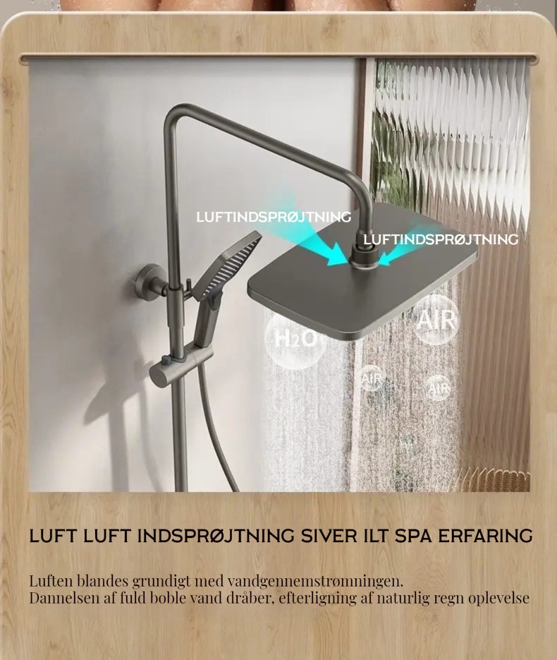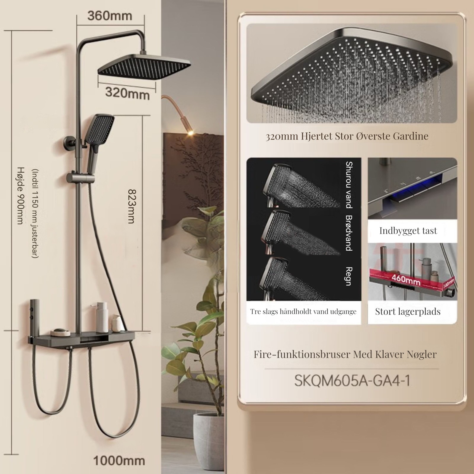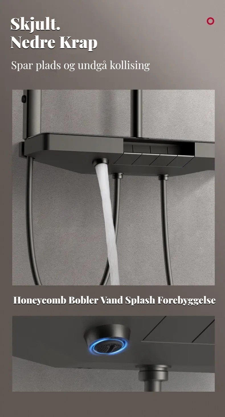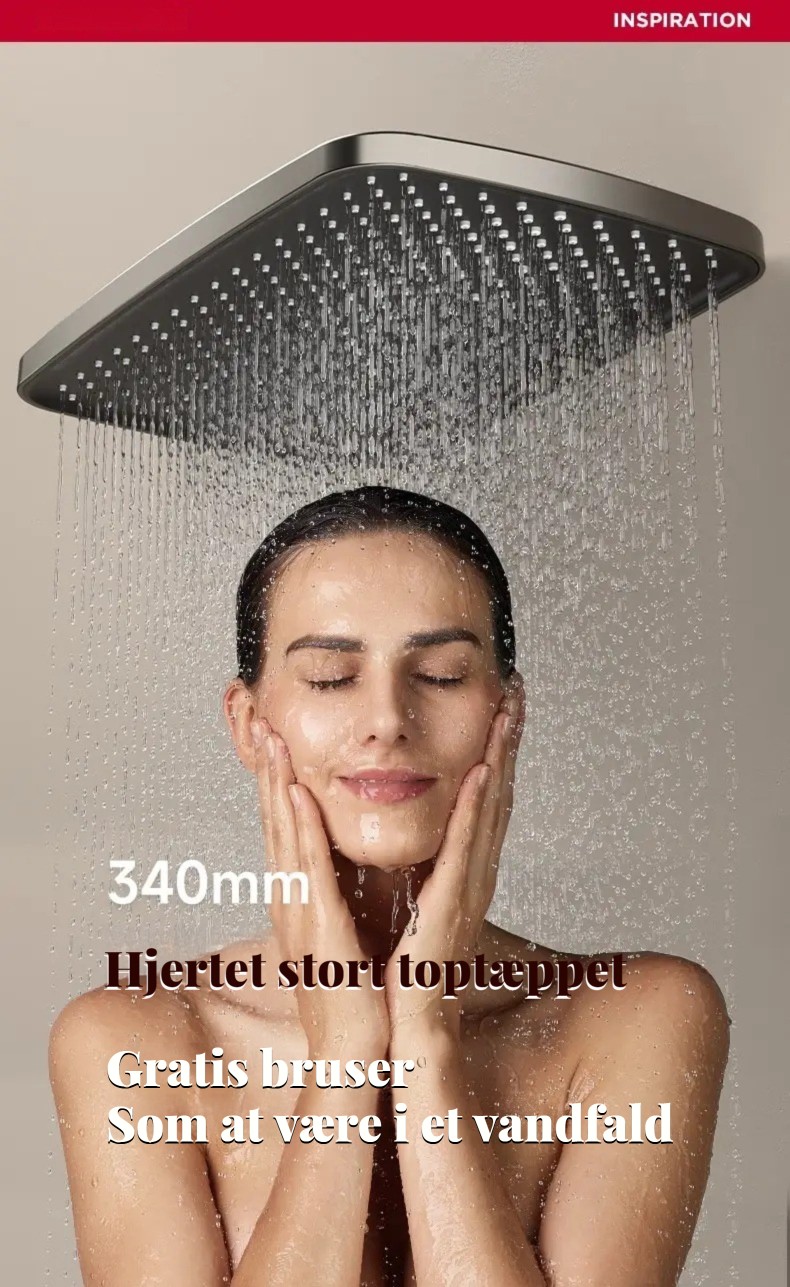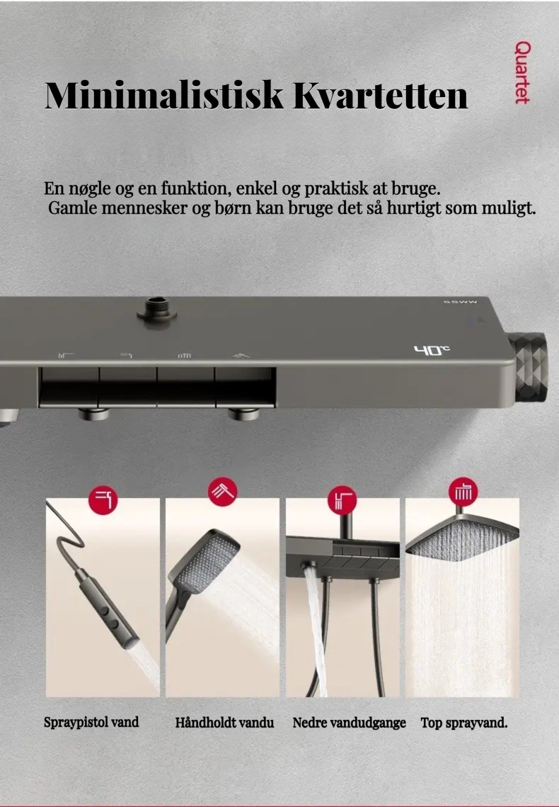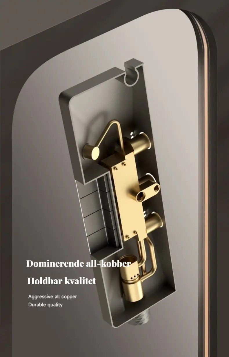 Brusersæt i seks dele. Det har en smart termostat, digitalt display, hydronisk kraft, messinghus og fire indstillingsmuligheder! Sættet kan refunderes for lækager!